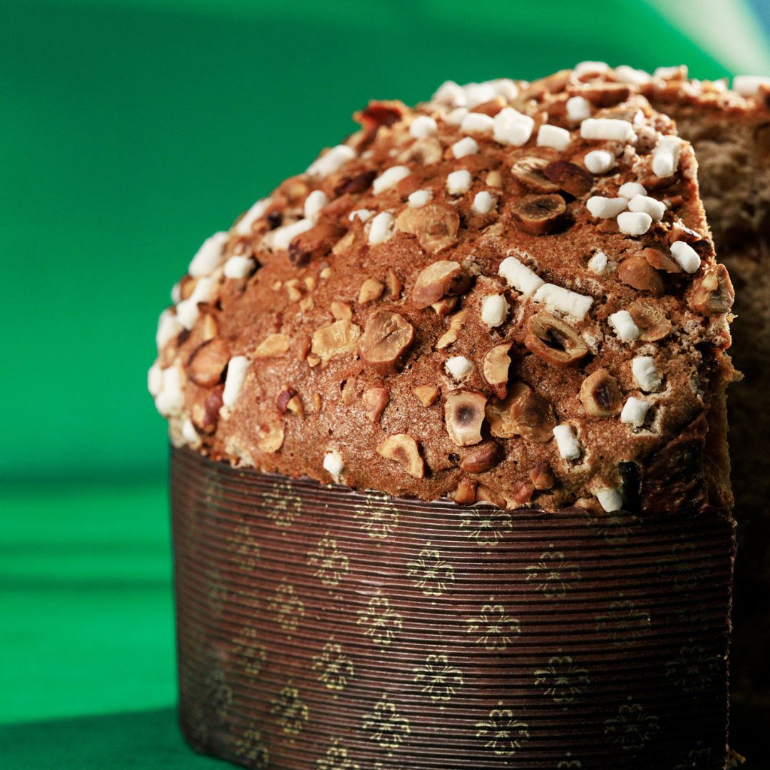 Panettone con canditi d’albicocca e “Cioccolato di Modica IGP” ricoperto di glassa e fogliame di nocciole, incartato a mano. Incarto a mano. 1000 gr.