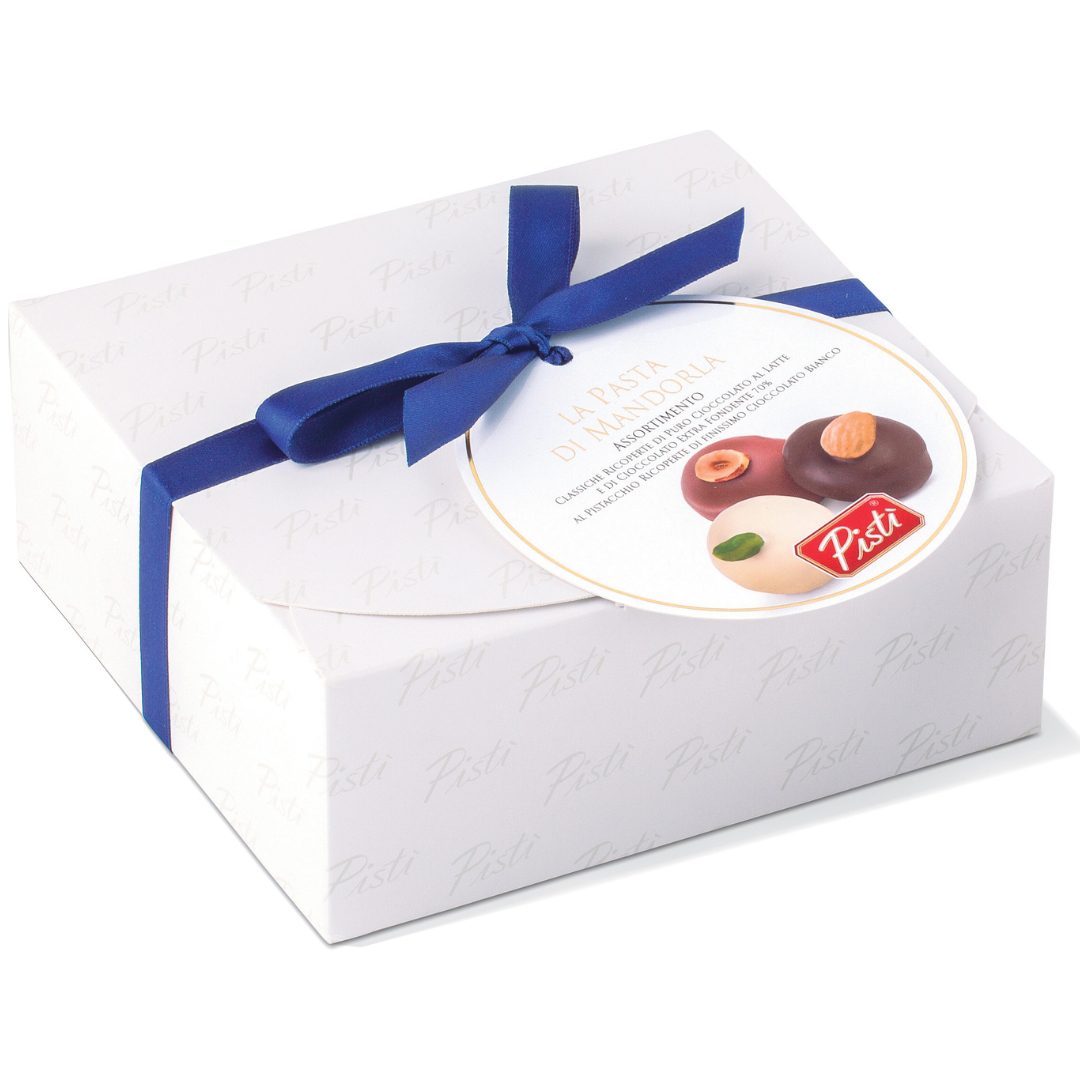 Cofanetto regalo paste di mandorla ricoperto di cioccolato 250 gr Pistì